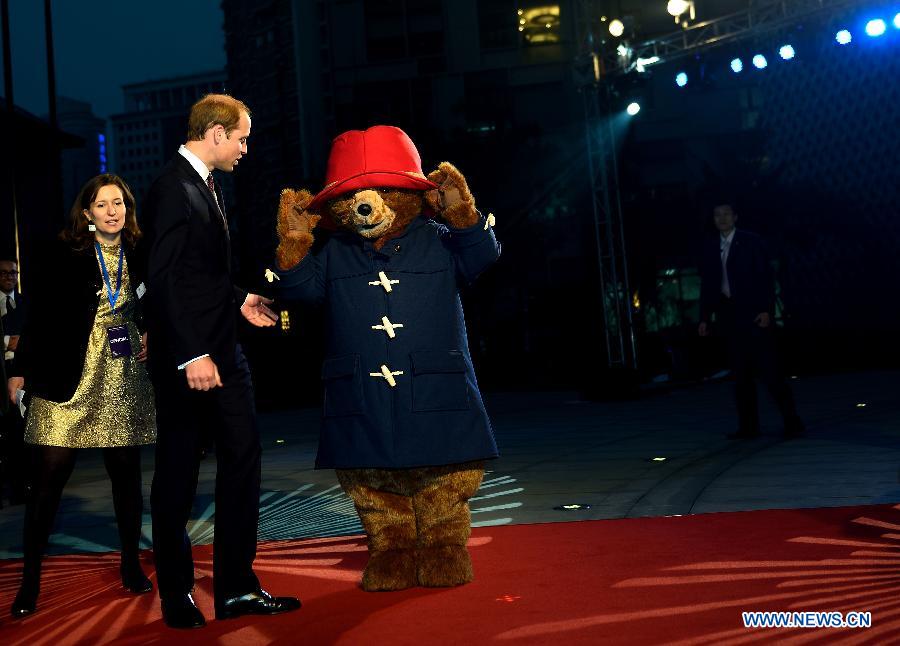 Britain's Prince William walks with a person wearing a Paddington bear costume during the Chinese premiere of "Paddington" at Shanghai Film Museum in Shanghai, east China, March 3, 2015. (Xinhua/Jin Liangkuai)