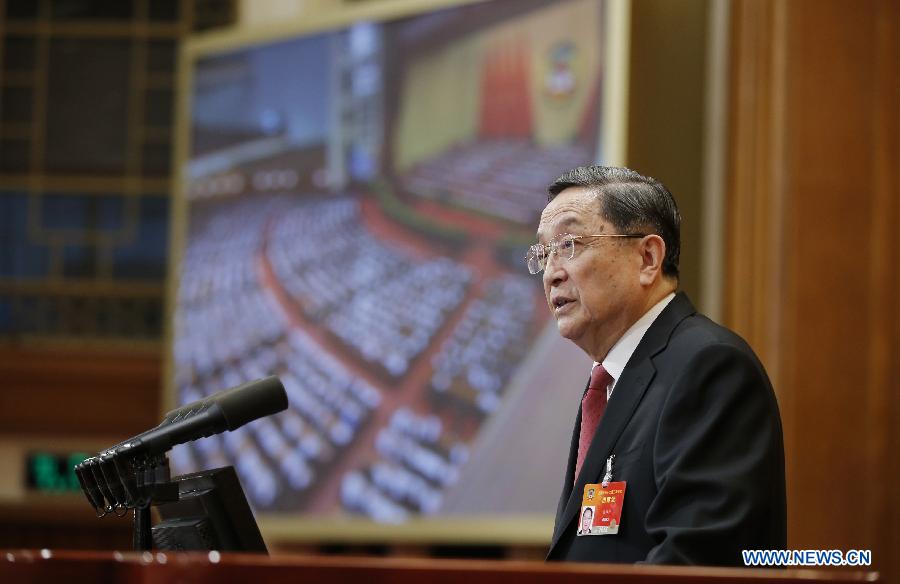 | Yu Zhengsheng, chairman of the National Committee of the Chinese People's Political Consultative Conference (CPPCC), delivers a report on the work of the CPPCC National Committee's Standing Committee at the third session of the 12th CPPCC National Committee at the Great Hall of the People in Beijing, capital of China, March 3, 2015. The third session of the 12th National Committee of the CPPCC opened in Beijing on March 3. (Xinhua/Ju Peng) |