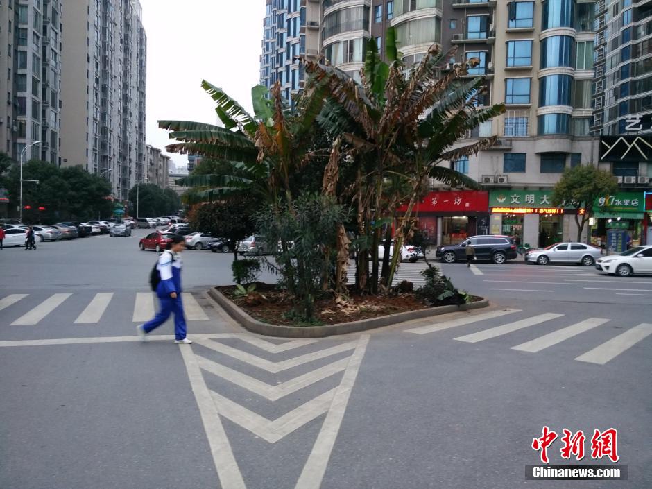 Instead of a refuge island, a parterre is built in the intersection of the three zebra crossings in the city of Chenzhou, central's China's Hunan province. Pedestrians complain that they have no place to stop after crossing the zebra crossings. (Photo/CNS)