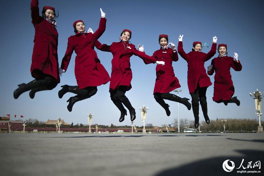 The stewards pose for photo at the Tiananmen Square in Beijing on Mar. 3 2015. Their warm smile become the beautiful landscape for the two sessions every year. (Photo/CFP)