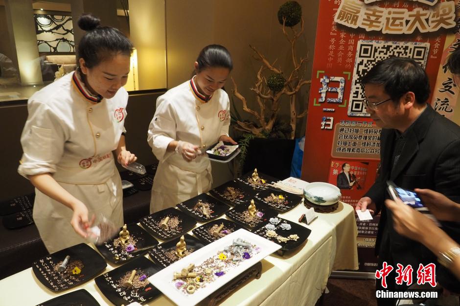 | Chocolate Terracotta warriors and bolts are displayed at a reception held by the Sichuan chamber of commerce in Los Angeles on March 2, 2015. Those pieces of chocolate are made by Chinese master chef Yang Yong. (CNS/ Mao Jianjun) |