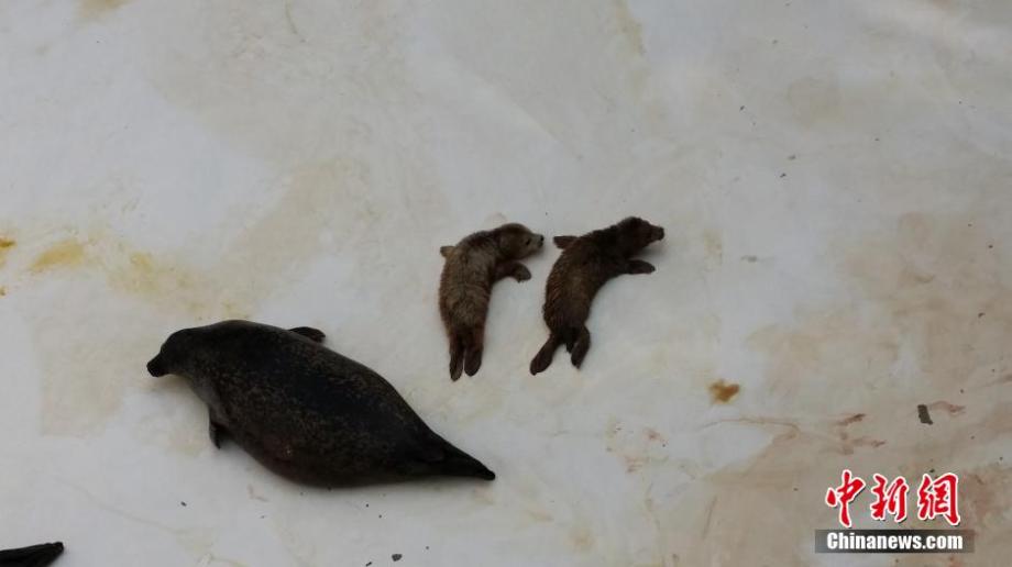 A female harbor seal gave birth to twins in an aquarium in Dalian on March 4, 2014. According to documents, this is the world's first case of harbor seal twins born in an artificial breeding environment. (CNS/Yang Yi)