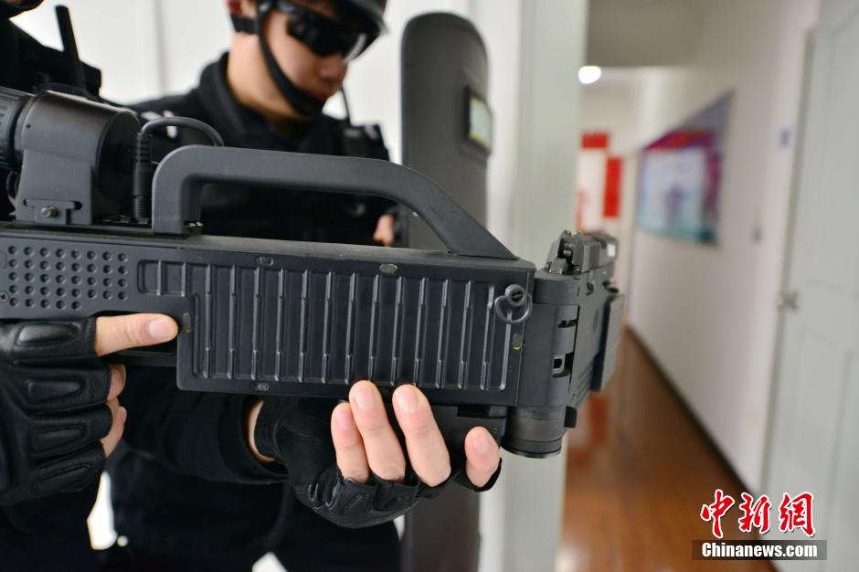Special police equipped with "corner gun" conduct a drill in Shanghai on March 3, 2015. (CNS/ Shen Chunchen)