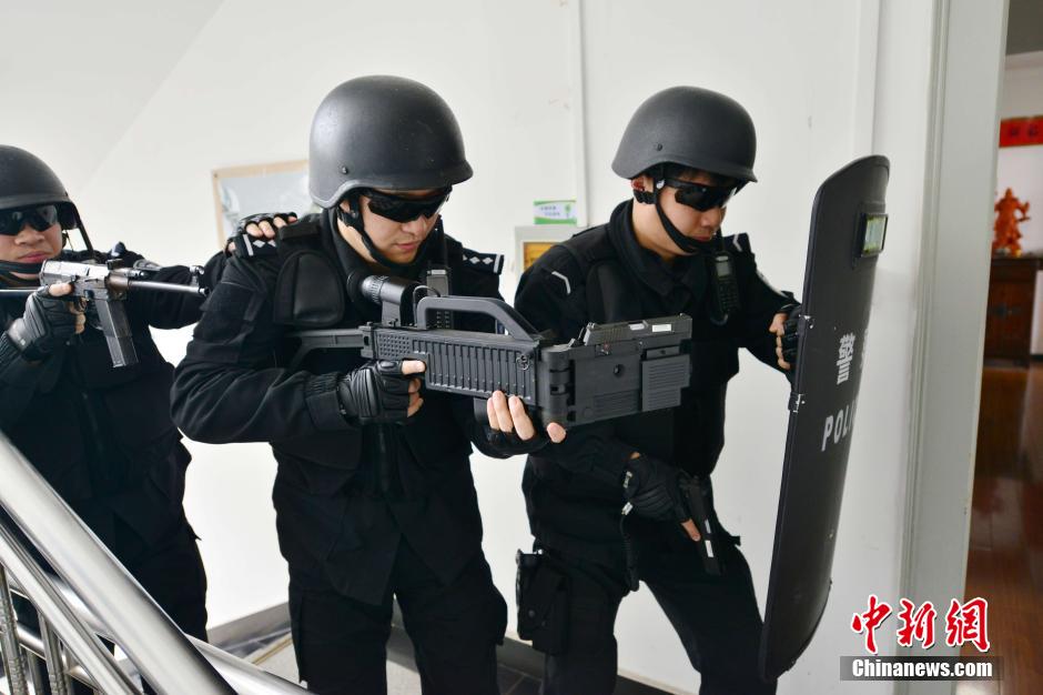 Special police equipped with "corner gun" conduct a drill in Shanghai on March 3, 2015. (CNS/ Shen Chunchen)