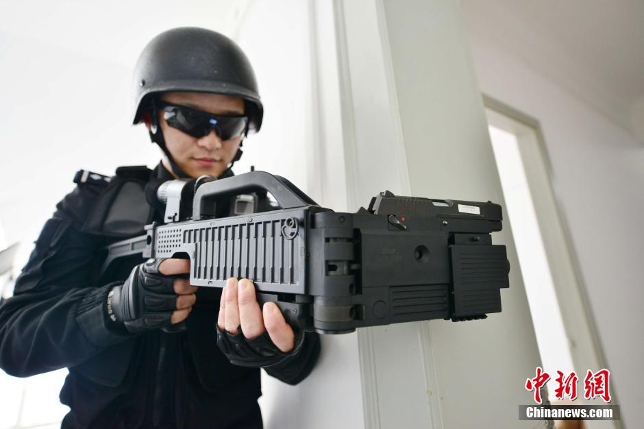 Special police equipped with "corner gun" conduct a drill in Shanghai on March 3, 2015. (CNS/ Shen Chunchen)