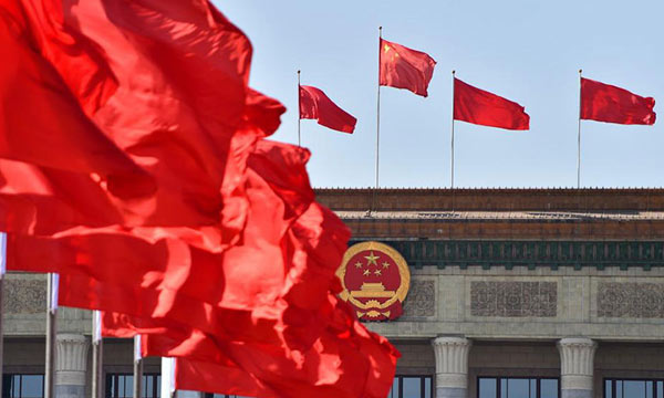 | Photo taken on March 1, 2015 shows the red flags fluttering gaily in the wind over the Tiananmen Square and the Great Hall of People in Beijing. The third session of the 12th National People's Congress (NPC) and the third session of the 12th Chinese People's Political Consultative Conference (CPPCC) are to open in Beijing on Thursday and Tuesday respectively. (People.cn/Photo) |