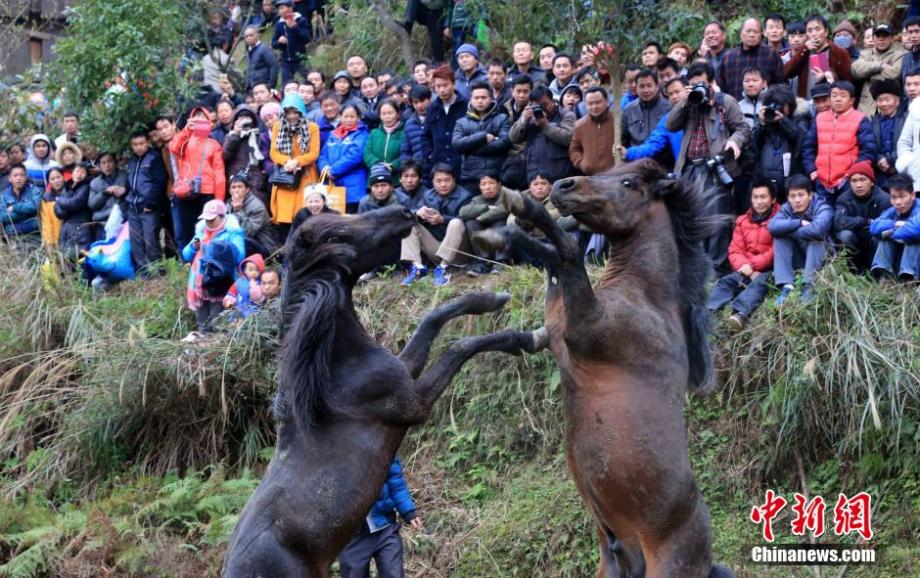 A horse fighting competition is held to celebrate the upcoming Lantern Festival in Rongshui Miao Autonomous County in southwest China's Guangxi on March 3, 2015. The horse fighting competition has a history of 500 years. It was originally set for ruling marriage dispute, and later became an entertainment for local people. (Photo/CNS)