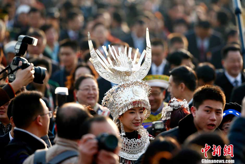 Ethnic minority deputies attend the opening meeting of the third session of the 12th National People's Congress. (Photo/Chinanews.com)