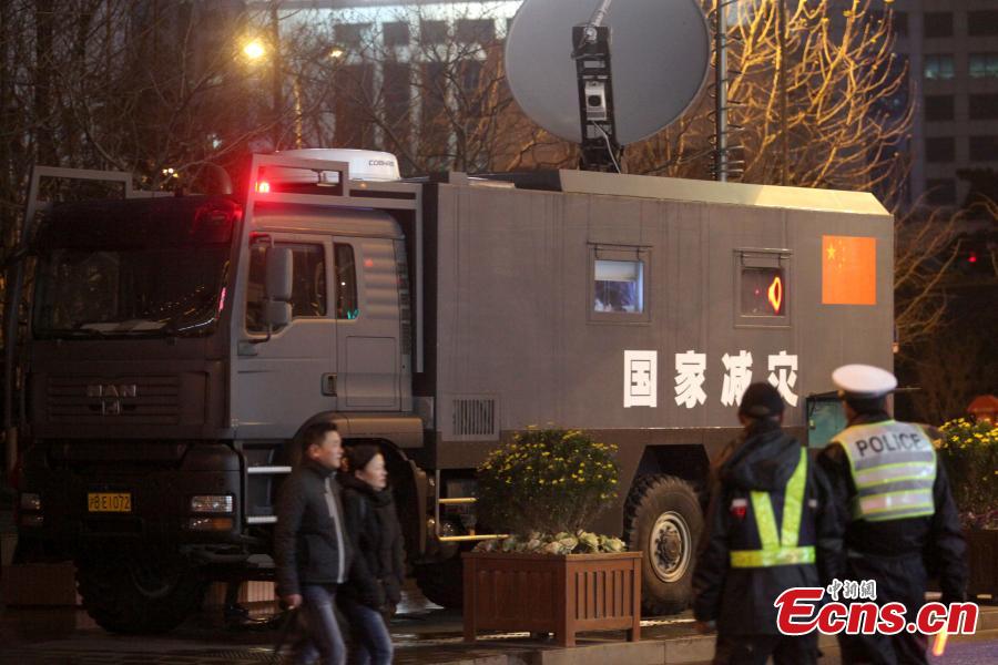 A high-tech vehicle is deployed to supervise visitors' flows near the Yuyuan Garden in Shanghai, March 5, 2015. To ensure the safety of visitors on the Lantern Festival, authorities in Shanghai have strengthened supervision of gatherings near local scenic spots. (Photo/Zhang Hengwei)