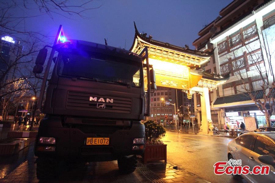 A high-tech vehicle is deployed to supervise visitors' flows near the Yuyuan Garden in Shanghai, March 5, 2015. To ensure the safety of visitors on the Lantern Festival, authorities in Shanghai have strengthened supervision of gatherings near local scenic spots. (Photo/Zhang Hengwei)