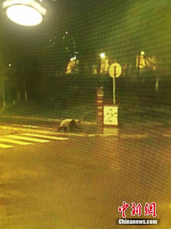 Video screenshot shows an adult giant panda appearing at 2 a.m. in the street of Yingxiu Town in southwest China's Sichuan province on March 5.