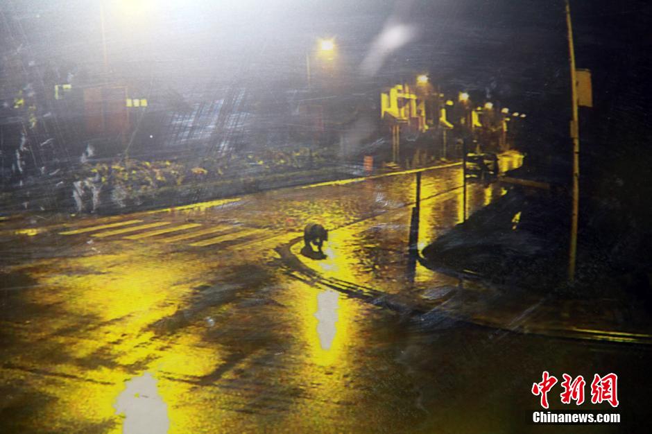 Video screenshot shows an adult giant panda appearing at 2 a.m. in the street of Yingxiu Town in southwest China's Sichuan province on March 5.
