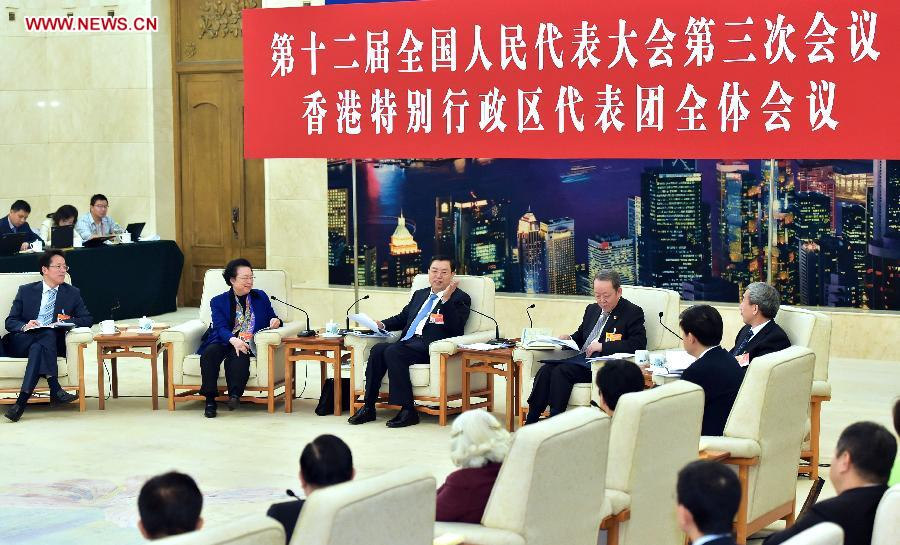 Zhang Dejiang (3rd L, back), chairman of the Standing Committee of China's National People's Congress (NPC) and a member of the Standing Committee of the Political Bureau of the Communist Party of China (CPC) Central Committee, joins a panel discussion with deputies from south China's Macao Special Administrative Region during the third session of the 12th NPC, in Beijing, capital of China, March 6, 2015. (Xinhua/Li Tao)