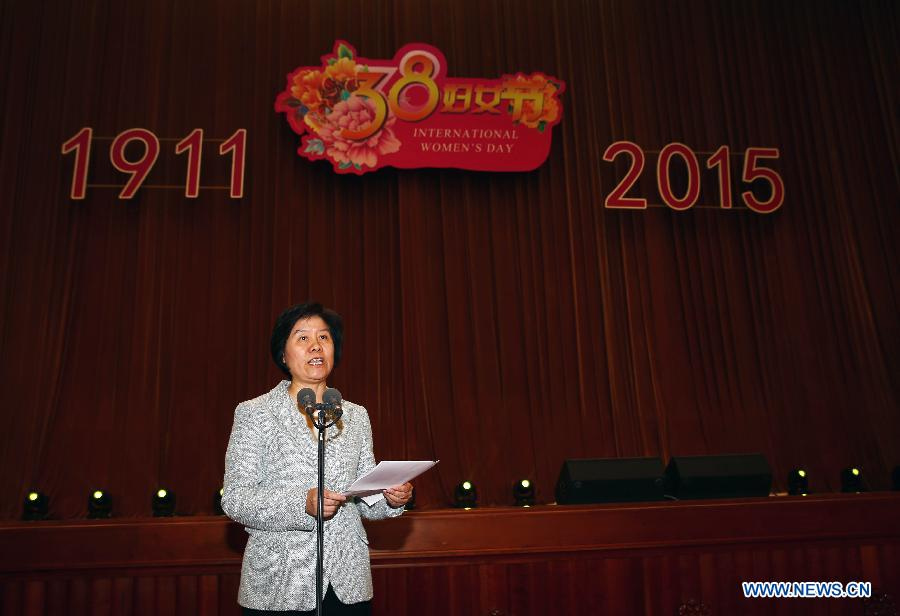 Shen Yueyue, president of the All-China Women's Federation and also vice chair of the Standing Committee of the National People's Congress, speaks at a reception celebrating the International Women's Day in Beijing, capital of China, March 6, 2015. The All-China Women's Federation held a gathering attended by female domestic workers and foreign diplomats in Beijing on Friday ahead of International Women's Day. (Xinhua/Yin Gang)