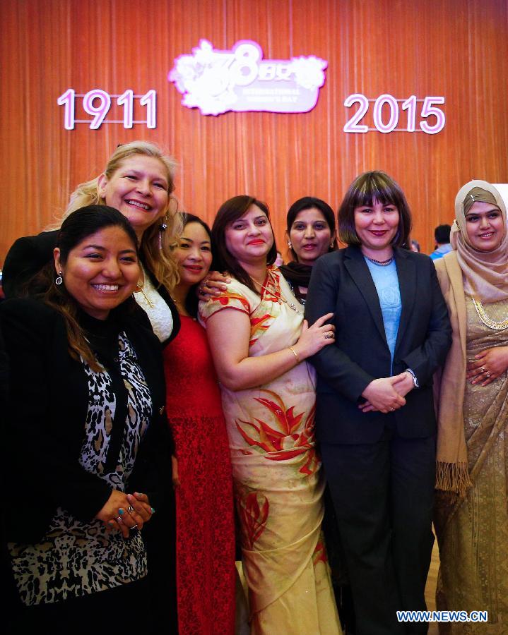 Guests pose for a group photo during a reception celebrating the International Women's Day in Beijing, capital of China, March 6, 2015. The All-China Women's Federation held a gathering attended by female domestic workers and foreign diplomats in Beijing on Friday ahead of International Women's Day. (Xinhua/Yin Gang)