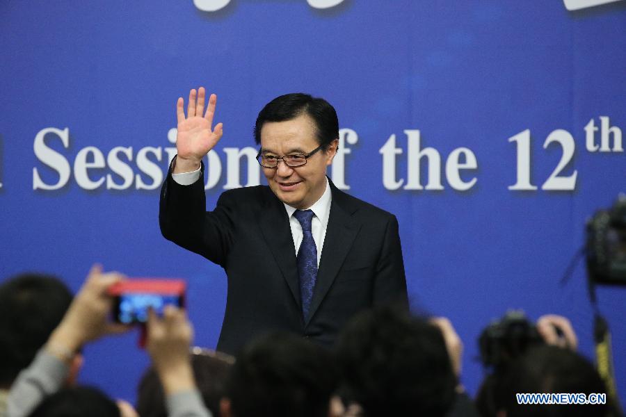 Chinese Minister of Commerce Gao Hucheng gives a press conference for the third session of China's 12th National People's Congress (NPC) on commercial development and opening up, in Beijing, capital of China, March 7, 2015. (Xinhua/Xing Guangli)