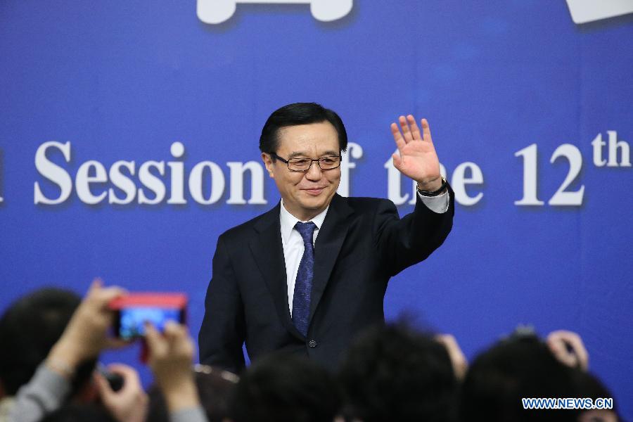 Chinese Minister of Commerce Gao Hucheng gives a press conference for the third session of China's 12th National People's Congress (NPC) on commercial development and opening up, in Beijing, capital of China, March 7, 2015. (Xinhua/Xing Guangli)