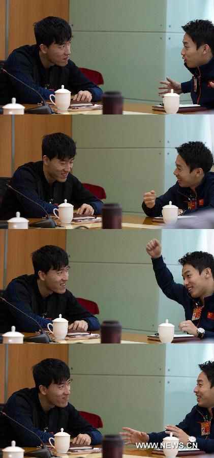 | The combination photo taken on March 8, 2015 shows athletes Liu Xiang (L) and Zou Kai, members of the 12th National Committee of the Chinese People's Political Consultative Conference (CPPCC), discuss on sports reform at the intervals of the third session of the 12th CPPCC National Committee in Beijing, capital of China. (Xinhua/Cai Yang) |