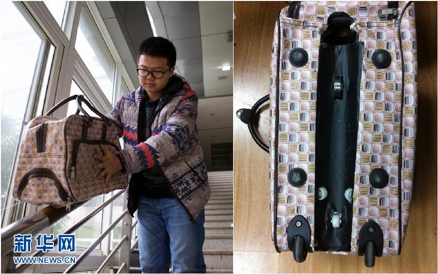 Right: Four wheels on the bottom of the "stairs climbing bag" on March 2, 2015. (Xinhua/Hu Chenhuan)