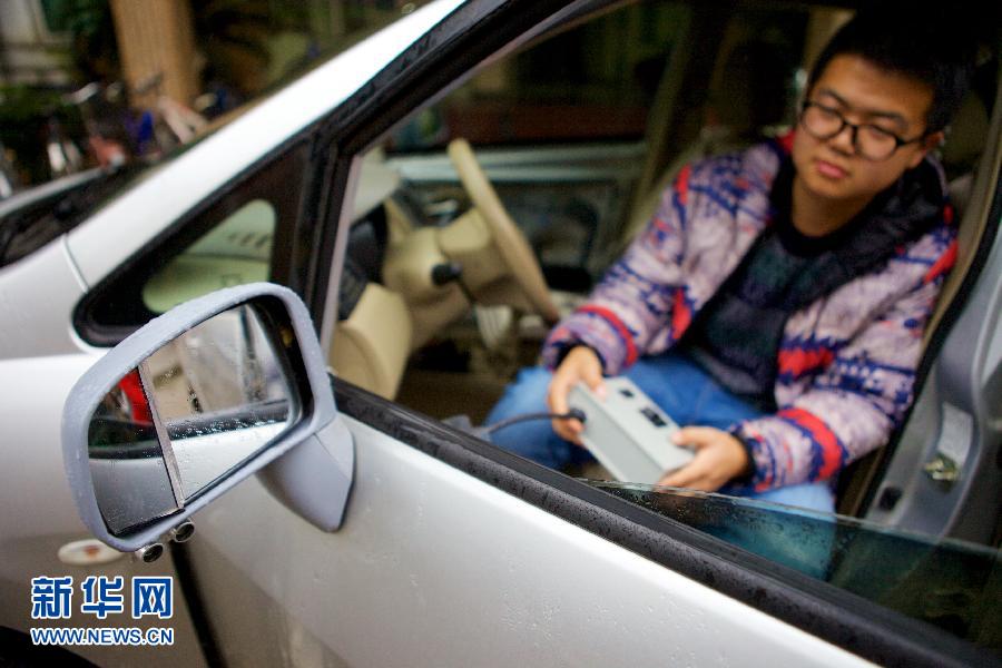 Zhang Hailong adjusts the "rearview mirror with non-blind area" on March 2, 2015. (Xinhua/Hu Chenhuan)