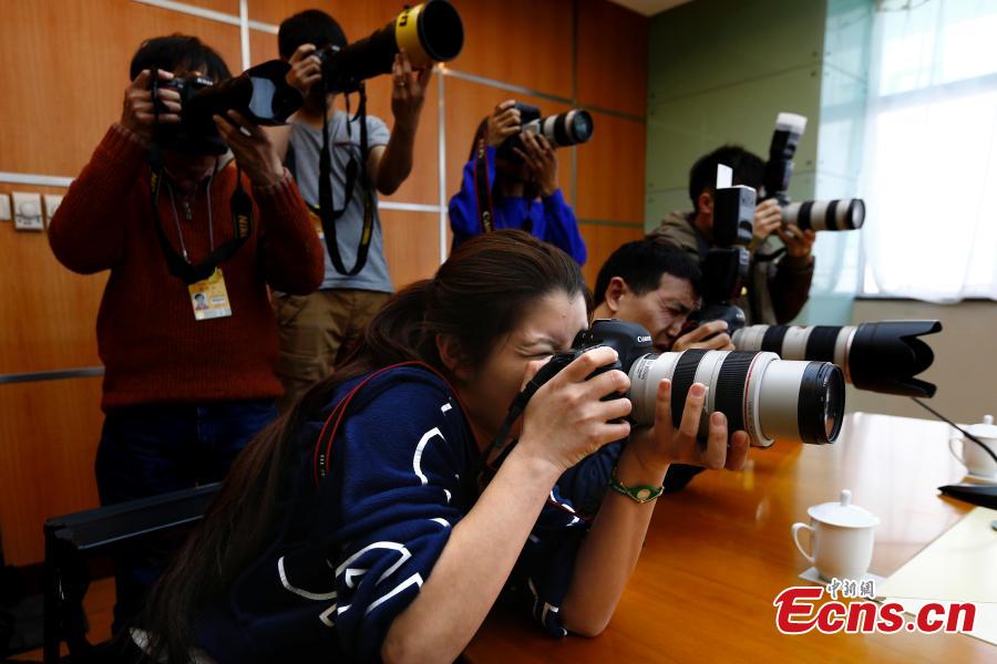 Female photographers take pictures of former NBA star Yao Ming at a press conference in Beijing, March 8, 2015. International Women’s Day is annually held on March 8 to celebrate women’s achievements throughout history and across nations. (Photo: China News Service/Fu Tian)