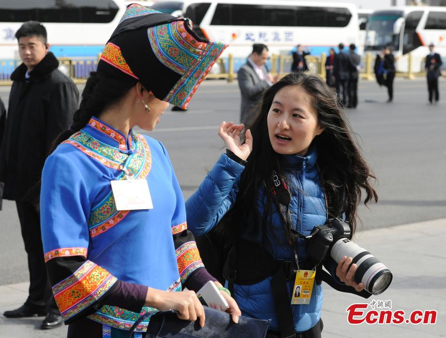 A female reporter interviews a deputy of the National People's Congress in Beijing, March 8, 2015. International Women’s Day is annually held on March 8 to celebrate women’s achievements throughout history and across nations. (Photo: China News Service/Hou Yu)