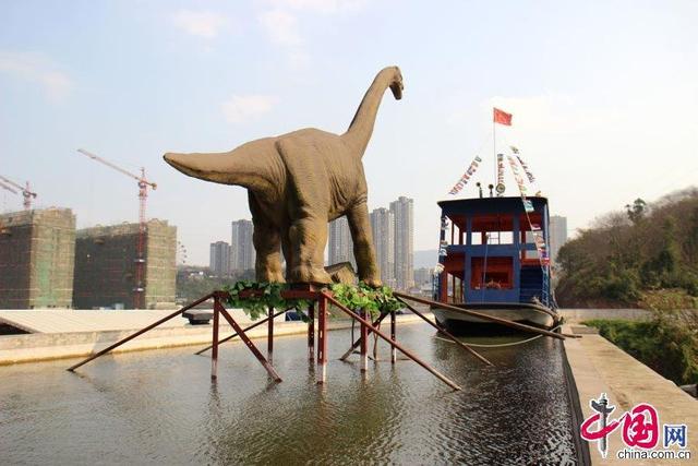 An artificial ‘sky river', which is more than 10 meters high from the ground, was built in the Foreigner Street in Chongqing. A huge "dinosaur" will confront with tourists and dragon boats in the river. (Photo/China.org)