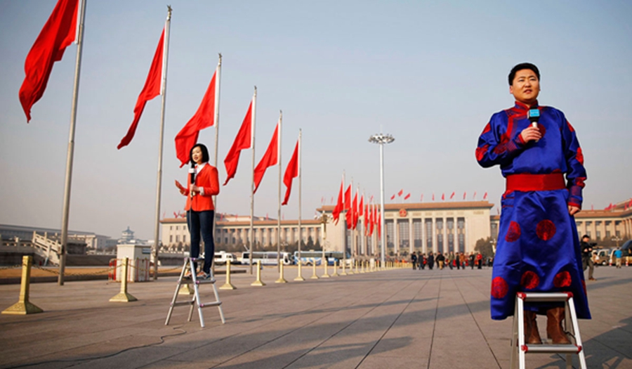 Two reporters give live coverage before the opening of the third session of the 12th National People's Congress (NPC) on March 5. (Reuters Photo)