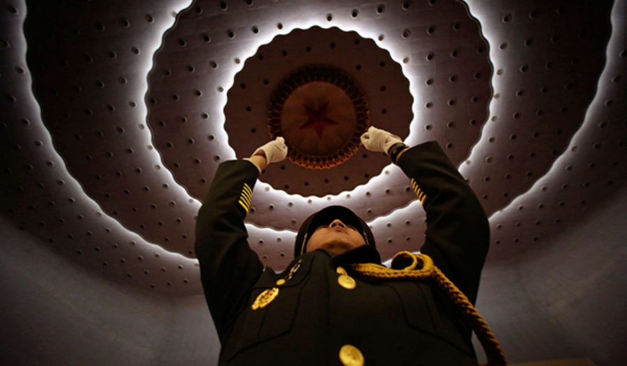 The conductor of the military band is in rehearsal before the opening ceremony of the third session of the 12th National People's Congress (NPC) on March 5. (Reuters Photo)