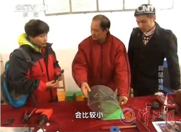 | Feng Xiaoming (middle) introduced the working principle of his mousetrap invention to CCTV reporter, CCTV-10 screenshot |