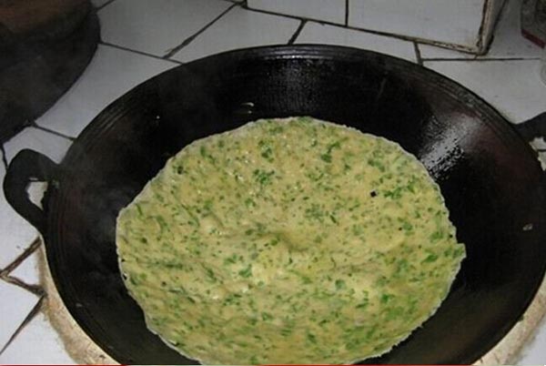 Since frying pan was absent in rural area, huge iron pan – the cooking utensil indispensible in every rural household – would be used over traditional wood-fueled oven for Tanmo making. To make ideal paste, salt should be put into flour before mixing it with moderate amount of cold water, minced seasonings like Chinese parsley, Chinese chives, fresh ginger, green Chinese onion, and, if possible, luxurious supplement of egg liquid.