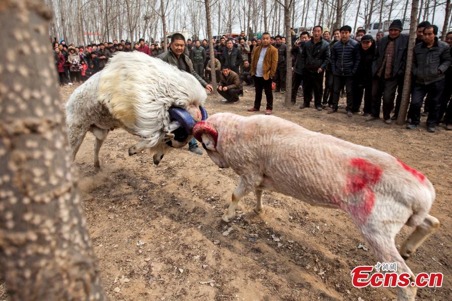 Two sheep fight during a contest at a village in Huaxian county, Central China’s Henan province, March 9, 2015. The Small-tail Han Sheep, a breed known for enjoying head butting among rams, were divided into groups according to age and weight in the single-elimination match. (Photo: China News Service/Wang Zirui)