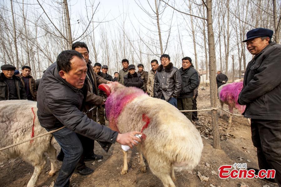 | Farmers check a sheep during a contest at a village in Huaxian county, Central China’s Henan province, March 9, 2015. The Small-tail Han Sheep, a breed known for enjoying head butting among rams, were divided into groups according to age and weight in the single-elimination match. (Photo: China News Service/Wang Zirui) |