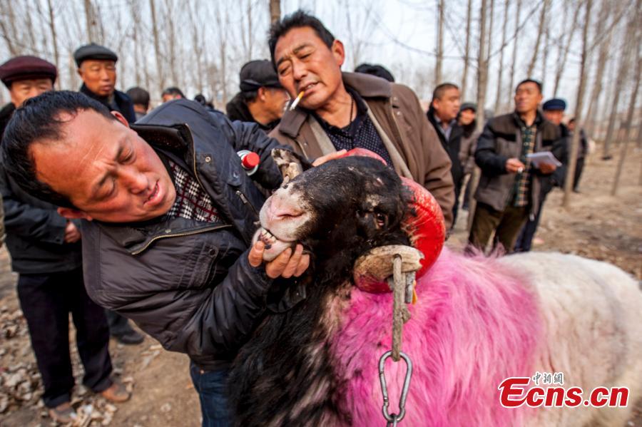 Farmers check a sheep during a contest at a village in Huaxian county, Central China’s Henan province, March 9, 2015. The Small-tail Han Sheep, a breed known for enjoying head butting among rams, were divided into groups according to age and weight in the single-elimination match. (Photo: China News Service/Wang Zirui)