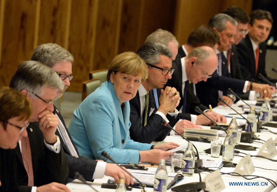 | Germany's Chancellor Angela Merkel (4th L) and Japan's Prime Minister Shinzo Abe (not pictured) take part in a meeting with German and Japanese business leaders in Tokyo, Japan, March 9, 2015. (Xinhua/Ma Ping) |