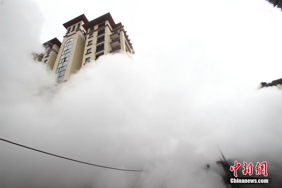 A malfunction in a steam pipe in Shaoxing, Zhejiang province leaves high-rise buildings around in "floating clouds" on March 9, 2015. (Photo/CNS)