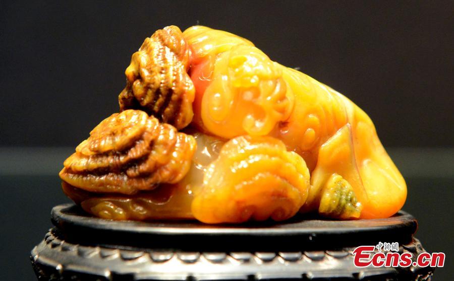 A Shoushan stone carving is on display in Fuzhou, East China’s Fujian province, March 10, 2015. The national and provincial masters present about 20 Shoushan stone carvings featuring a broad range of topics, such as Buddhist figures, in the exhibition. With a soft, smooth surface and various colors, Shoushan stone from a mountain called Shoushan in the province, is an ideal material for carving and is known as "the top grade-colored stone for carving." It is characterized by exquisiteness, smoothness, softness, and cohesion. (Photo: China News Service/Liu Kegeng)