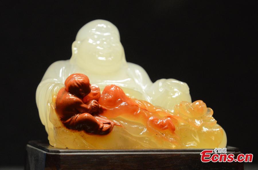 | A Shoushan stone carving is on display in Fuzhou, East China’s Fujian province, March 10, 2015. The national and provincial masters present about 20 Shoushan stone carvings featuring a broad range of topics, such as Buddhist figures, in the exhibition. With a soft, smooth surface and various colors, Shoushan stone from a mountain called Shoushan in the province, is an ideal material for carving and is known as "the top grade-colored stone for carving." It is characterized by exquisiteness, smoothness, softness, and cohesion. (Photo: China News Service/Liu Kegeng) |