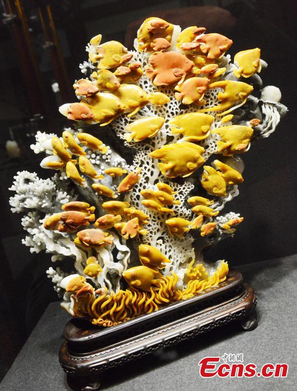 A Shoushan stone carving is on display in Fuzhou, East China’s Fujian province, March 10, 2015. The national and provincial masters present about 20 Shoushan stone carvings featuring a broad range of topics, such as Buddhist figures, in the exhibition. With a soft, smooth surface and various colors, Shoushan stone from a mountain called Shoushan in the province, is an ideal material for carving and is known as "the top grade-colored stone for carving." It is characterized by exquisiteness, smoothness, softness, and cohesion. (Photo: China News Service/Liu Kegeng)