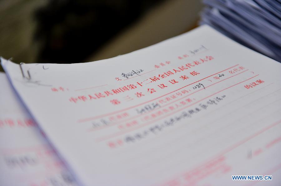 Photo taken on March 10, 2015 shows the the original copies of motions in Beijing, capital of China. Among the 522 motions, 511 are about legislation and 8 are related to supervision. In addtion, 74.9 percent of the motions are accomplished by investigation, inspection, visit, discussion and etc. (Xinhua/Li Xiang)