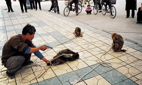 | A busker playing cops and robbers with a monkey as part of their show. (Photo: Ma Hongjie) |