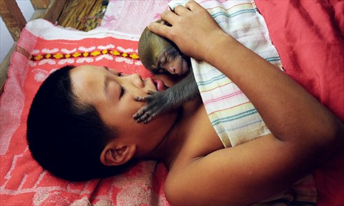 | A boy cradles his monkey in his arms. (Photo: Ma Hongjie) |