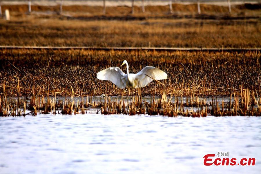 An egret is seen at the National Wetland Park in Zhangye city, Northwest China’s Gansu province, March 10, 2015. The wetland, with a planned area of 4,100 hectares, severs as an important source of drinking water and for feeding for migratory birds.(Photo: China News Service/Chen Li)