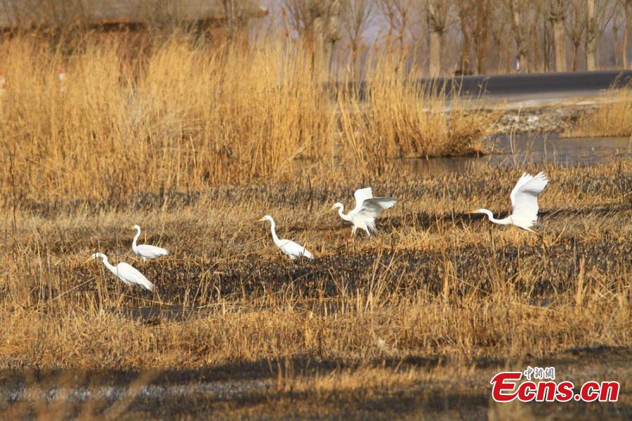 A flock of egrets are seen at the National Wetland Park in Zhangye city, Northwest China’s Gansu province, March 10, 2015. The wetland, with a planned area of 4,100 hectares, severs as an important source of drinking water and for feeding for migratory birds. (Photo: China News Service/Chen Li)