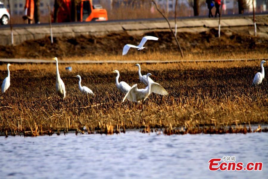 | A flock of egrets are seen at the National Wetland Park in Zhangye city, Northwest China’s Gansu province, March 10, 2015. The wetland, with a planned area of 4,100 hectares, severs as an important source of drinking water and for feeding for migratory birds. (Photo: China News Service/Chen Li) |