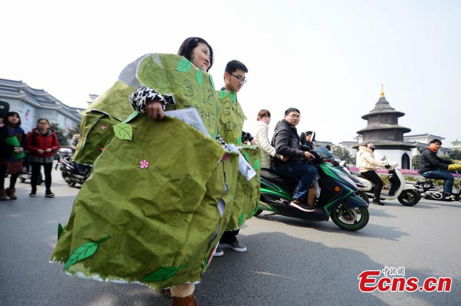 University students present creations made of newspapers, paper bags and other waste materials during an event in Yangzhou, East China’s Jiangsu province, March 11, 2015. The event aimed to promote public awareness of environmental protection and introduce knowledge of afforestation ahead China’s national Tree Planting Day celebrated on March 12 each year.(Photo: China News Service/Meng Delong)