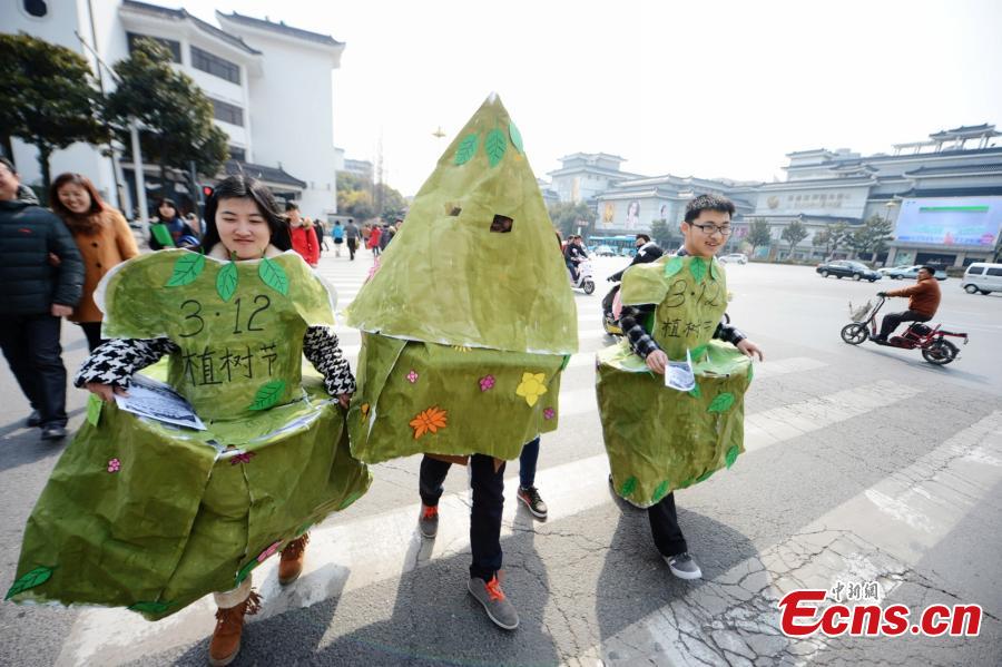 University students present creations made of newspapers, paper bags and other waste materials during an event in Yangzhou, East China’s Jiangsu province, March 11, 2015. The event aimed to promote public awareness of environmental protection and introduce knowledge of afforestation ahead China’s national Tree Planting Day celebrated on March 12 each year.(Photo: China News Service/Meng Delong)