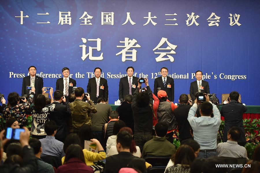 | Xie Heping, Shen Jian, Luo Weiqi, Li Jianbao, Zheng Qiang, five deputies to the 12th National People's Congress (NPC), give a press conference about China's higher education during the third session of the 12th NPC in Beijing, capital of China, March 13, 2015. (Xinhua/Li Ran) |