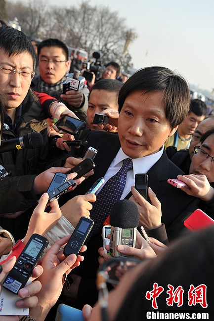 Lei Jun, Xiaomi's co-founder and CEO, answers journalists' questions when he walks to the Great Hall of the People during the "two sessions" in 2013.Lei, together with Robin Li from Baidu and Pony Ma from Tencent, became internet industry's first three deputies attending the "two sessions". [Photo/Chinanews]