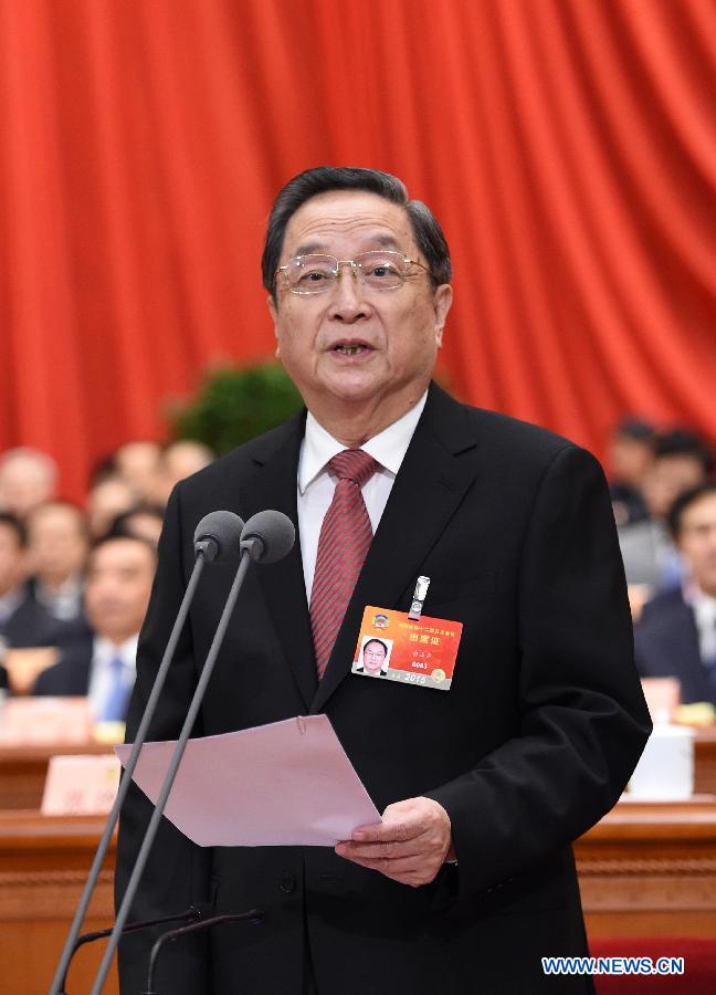 Yu Zhengsheng, chairman of the National Committee of the Chinese People's Political Consultative Conference (CPPCC), presides over the closing meeting of the third session of the 12th National Committee of the CPPCC in Beijing, capital of China, March 13, 2015. (Xinhua/Li Xueren)